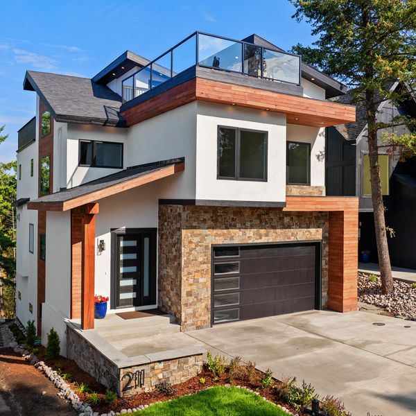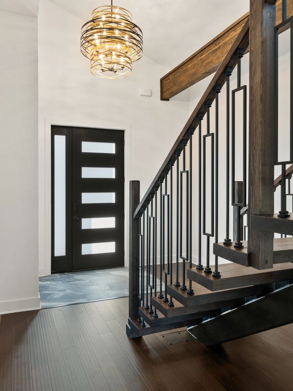 Inside, oversized windows flood the space with natural light in every season, highlighting the open custom iron staircase and hardwood floors throughout. The sleek exterior design combines stucco, Montana timber, and natural thin veneer stone, creating a striking yet timeless aesthetic.
